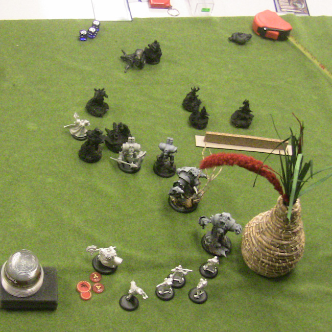 At this point I'm getting ready charge with my second wave. I'm pretty surprised that I have Assassins left. One thing that I've got going for me is I have all of my heavy hitters left-- 3 'jacks, Great Bears, and Butcher sitting with Iron Flesh and Focus and the Dog. Just gotta reach his line!